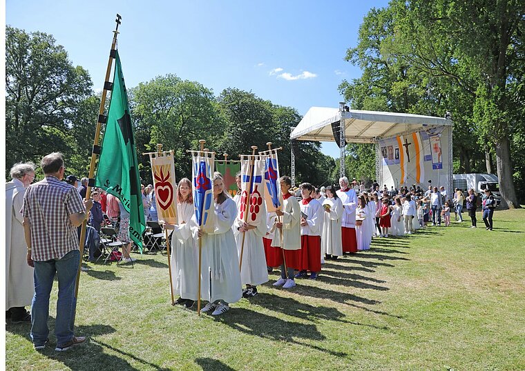 Nach dem Gottesdienst wurde eine konsekrierte Hostie (das zur Eucharistie verwendete Brot) in einem Schaugefäß, der Monstranz, in einer Prozession durch den Bürgerpark getragen.