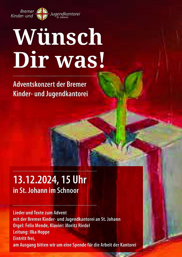 Die Bremer Kinder- und Jugendkantorei lädt ein zum Adventskonzert am Samstag, 13. Dezember um 15 Uhr in die Propsteikirche St. Johann im Schnoor. Auf dem Programm stehen Lieder und Texte zur Adventszeit. Das Konzert steht unter der Überschrift "Wünsch Dir was!"