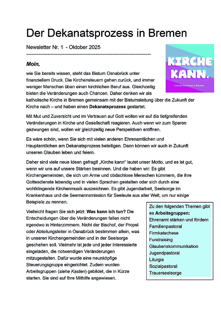 Die katholische Kirche in Bremen ist zum Sparen gezwungen, will aber gleichzeitig neue Perspektiven eröffnen. Daher denkt sie zusammen mit der Bistumsleitung in Osnabrück über die Zukunft der Kirche nach und hat einen Dekanatsprozess gestartet. Ausführliche Informationen dazu gibt es auf dieser Homepage hier: Dekanatsprozess und in einem Newsletter, der hier abrufbar ist: Newsletter Nr. 1.