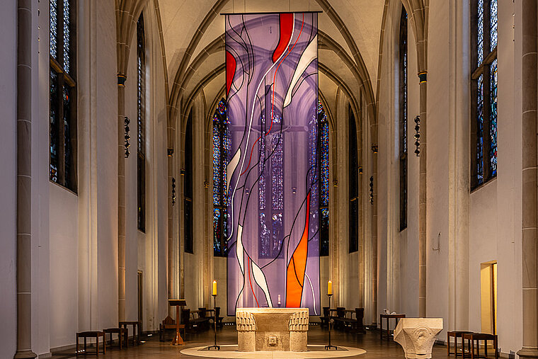 Jessica Buhlmann lässt ein weiches, weitmaschiges Gewebe vor dem Kreuz herunterfließen, das an Blattadern, organische Netze oder auch die Facetten eines Bleiglasfensters erinnert. So schafft sie mit der Herstellung von Durchblicken, Zuständen und Abschattungen eine räumlich-visuelle Intervention im Altarraum der Propsteikirche.