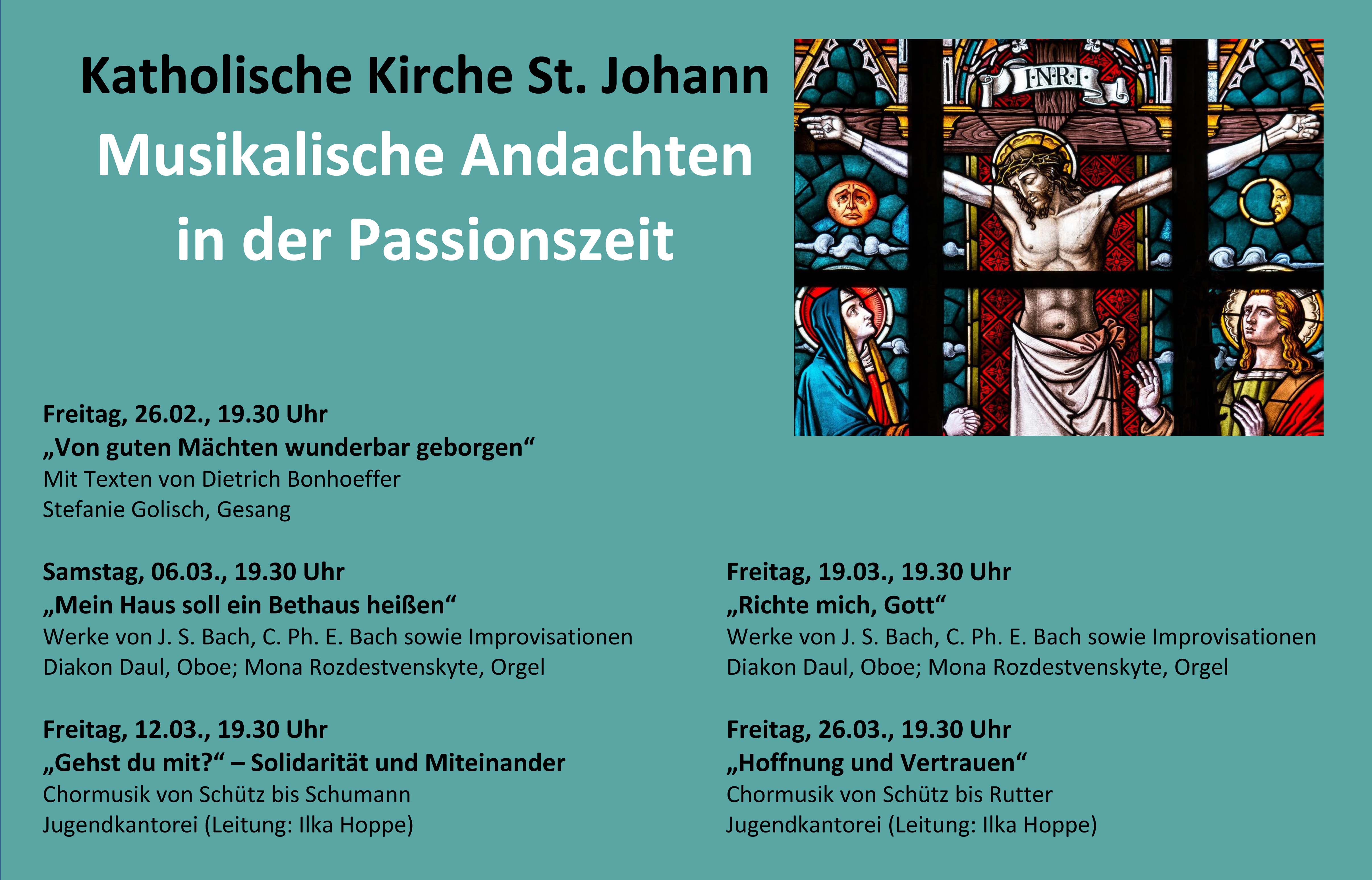 Vom 26. Februar an lädt die Propsteigemeinde St. Johann zu den musikalischen Andachten in der Passionszeit jeweils freitags um 19.30 Uhr ein. Die fünf Andachten in der Propsteikirche St. Johann geben Gelegenheit zu innerer Einkehr und Besinnung, aber auch Anregungen zum Nachdenken: Neben der Musik werden unter anderem auch die Evangelien der Fastensonntage in Texten und Lesungen betrachtet.