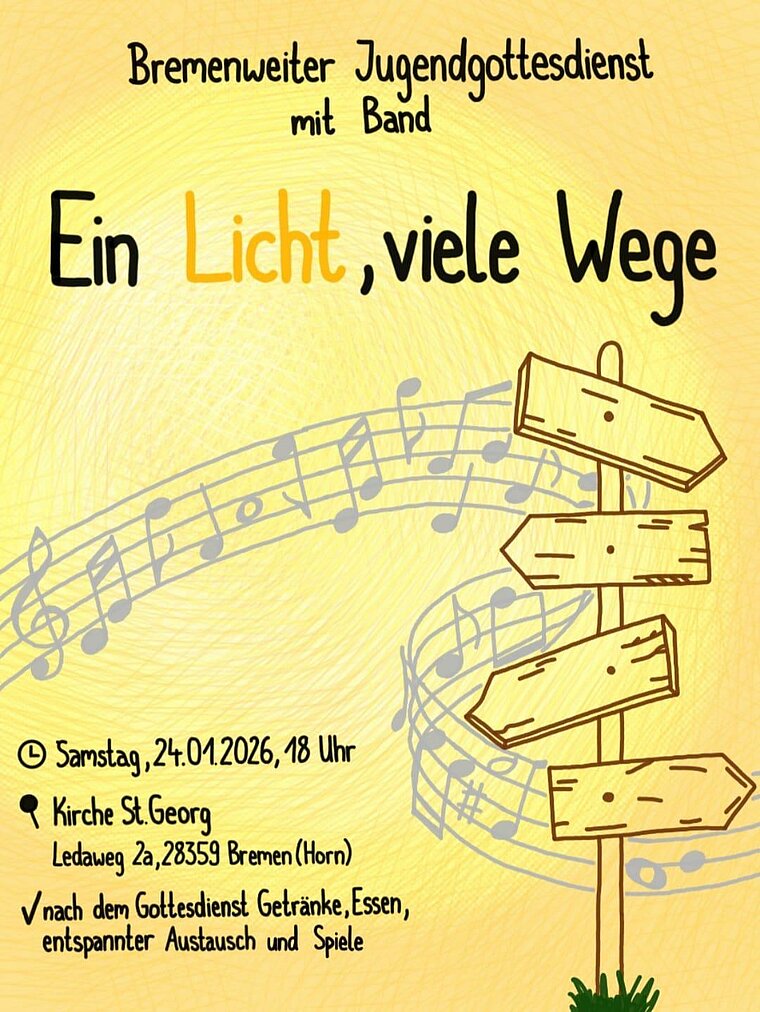 Der Jugendgottesdienst wird am Samstag, 24. Januar um 18 Uhr in der Kirche St. Georg in Bremen-Horn (Ledaweg 2a) gefeiert. Die Kirche ist mit der Straßenbahn über die Linie 4 gut zu erreichen - die Haltestelle "Vorstraße" liegt direkt neben der Kirche.