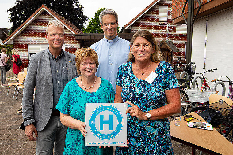 Die katholische St.-Antonius-Schule in Bremen-Osterholz hat das Gütesiegel der Schulstiftung im Bistum Osnabrück „Gemeinsam gegen sexualisierte Gewalt“ erhalten. Schulrat Axel Diekmann händigte das Schild mit der Aufschrift „Sage halt – finde Halt“ an die Leiterin der Grundschule, Annette Prevot, und Konrektorin Anja Finke aus. Mit dabei war Pfarrer Marc Weber von der Kirchengemeinde St. Raphael als Unterstützer der Schule.