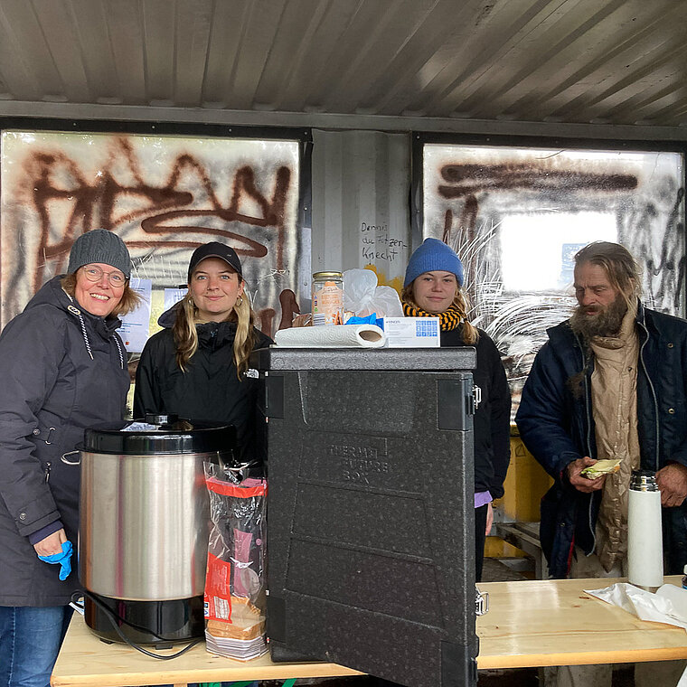 Mitglieder des Pfarrgemeinderates hatten die Brötchen beim Wohnungslosenfrühstück vorbereitet und waren bei der Ausgabe am Depot unterstützend tätig. Trotz des ungemütlichen Wetters kamen viele Gäste und nahmen dankbar Brötchen, Würstchen und Joghurts entgegen. Ein bisschen Schokolade versüßte vielen Gästen noch zusätzlich den Alltag.
